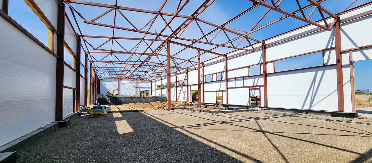 Базисные конструкции металлического каркаса — поперечная рама и стропильная ферма. Рама образует колонны, соединенные с фундаментом, а ферма связана с колоннами с помощью шарниров. Нагрузка равномерно распределяется между колоннами и фермой. На колонны приходится нагрузка значительно больше: собственная масса, вес крана и воздействие погодных условий (дождь, ветер, снег и другие).